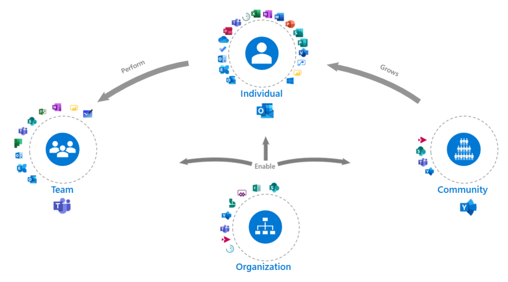 The Community is likely the least understood and appreciated area of productivity. Most Yammer networks fail not because of the tool (we see networks based on many platforms fail at the same rate), but because the organisation places no value on communities, and doesn’t provide the resources needed to foster them. As the model explains, the community exists to help the individual grow and learn through connections to resources the individual or the team didn’t know existed. These are large conversations to address larger topics than are typically addressed by one team’s scope. As I tell all my customers, properly adopting Yammer is a culture decision, not a technology decision.